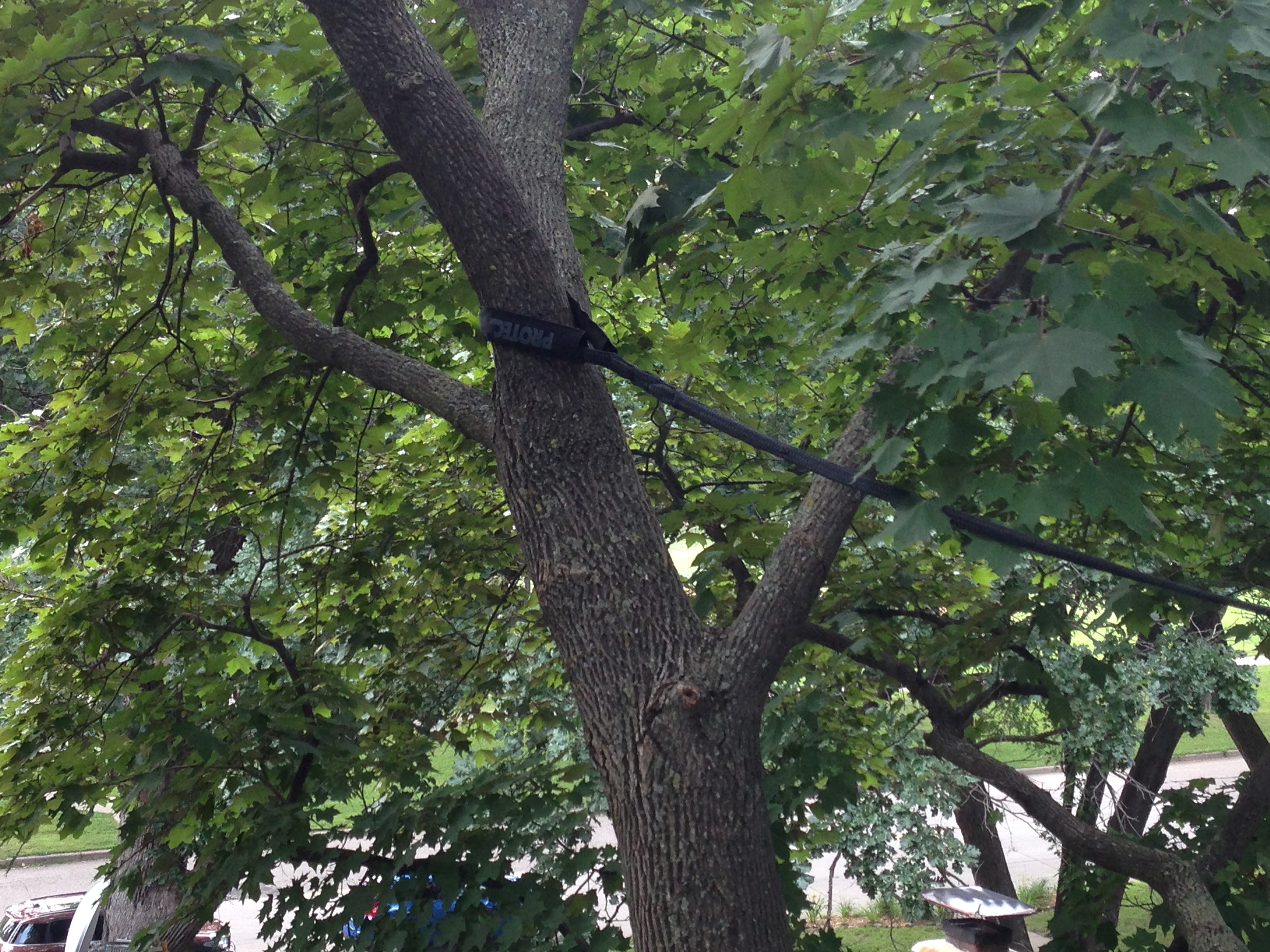 Hardware such as cables or braces can be installed in trees to provide extra support by limiting the movement of limbs. When used wisely, they may reduce the risk of failure and extend the life of the tree. A dynamic cable is used in a tree with included bark or weak branch attachments that have not yet started to split. Steel cables and bolting are system used for weak branch attachments that have started to split, reducing risk of failure.